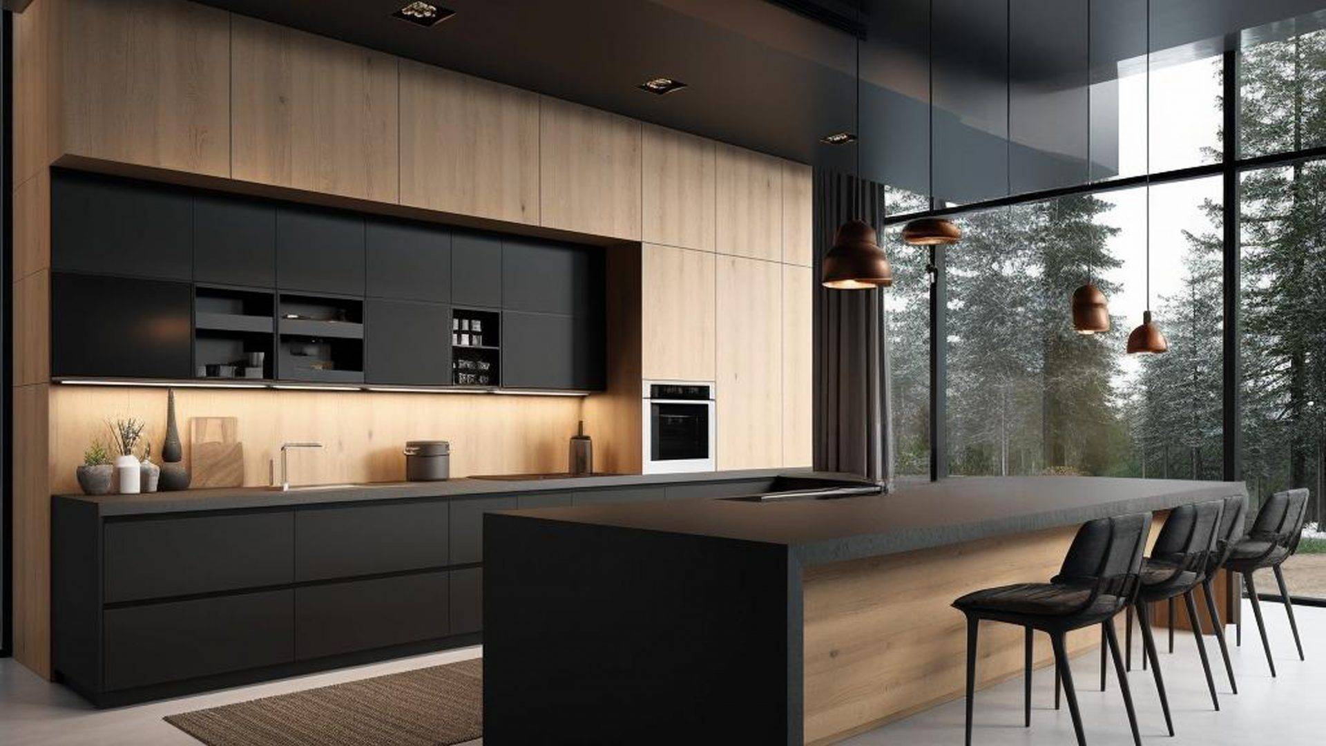 Una cocina en colores madera y negro minimalista, que proyecta sofisticación y carácter. La madera agrega calidez y textura natural, mientras que el negro aporta elegancia, modernidad y contraste. Este diseño crea un ambiente acogedor, audaz y visualmente equilibrado.